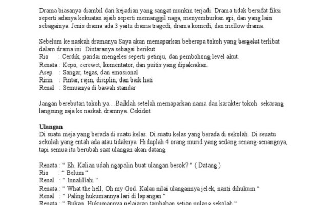 Naskah yang berisi dialog tersebut kemudian . Baca saja artikel ini sampai selesai. Drama biasa juga disebut teater. Nasehat teman tentang pentingnya pendidikan · sinopsis drama remaja · (adsbygoogle = window.adsbygoogle || ).push({});. Teks drama adalah sebuah naskah mengenai jalan cerita sebuah drama yang disiapkan dalam bentuk perbincangan atau obrolan dan .
